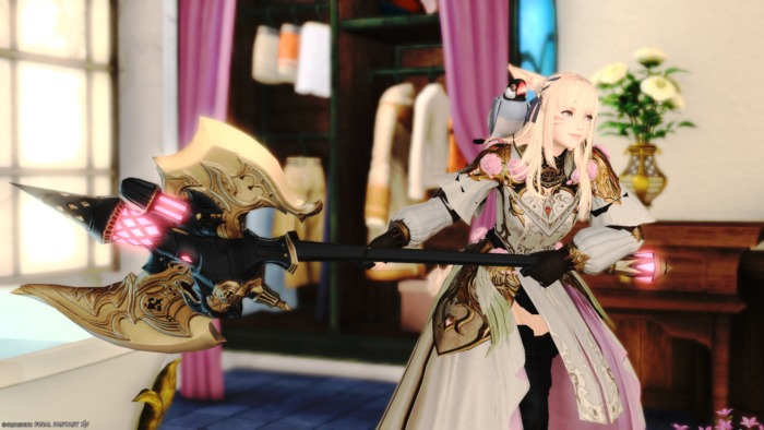 パッチ7.4で新たに追加された製作装備「コートリーラヴァー」。ピンク×ブラックの可憐な配色と薔薇やハートのモチーフに一目惚れして、今回はタンク装備でふんわり可愛いミラプリに挑戦しました 手防具選びにとても悩みつつも、クラフター装備でやさしい